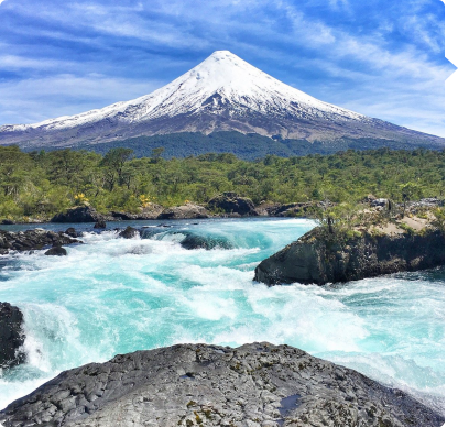 Dans l'après-midi, visite de Petrohue. Situé au cœur de la région des Lacs, Petrohué est une véritable perle naturelle du sud du Chili. Niché au sein du Parc National Vicente Pérez Rosales, ce site enchanteur est célèbre pour ses rapides de Petrohué, où l’eau turquoise issue du lac Todos los Santos dévale des formations rocheuses volcaniques, sculptées au fil des siècles par la lave et l’érosion.